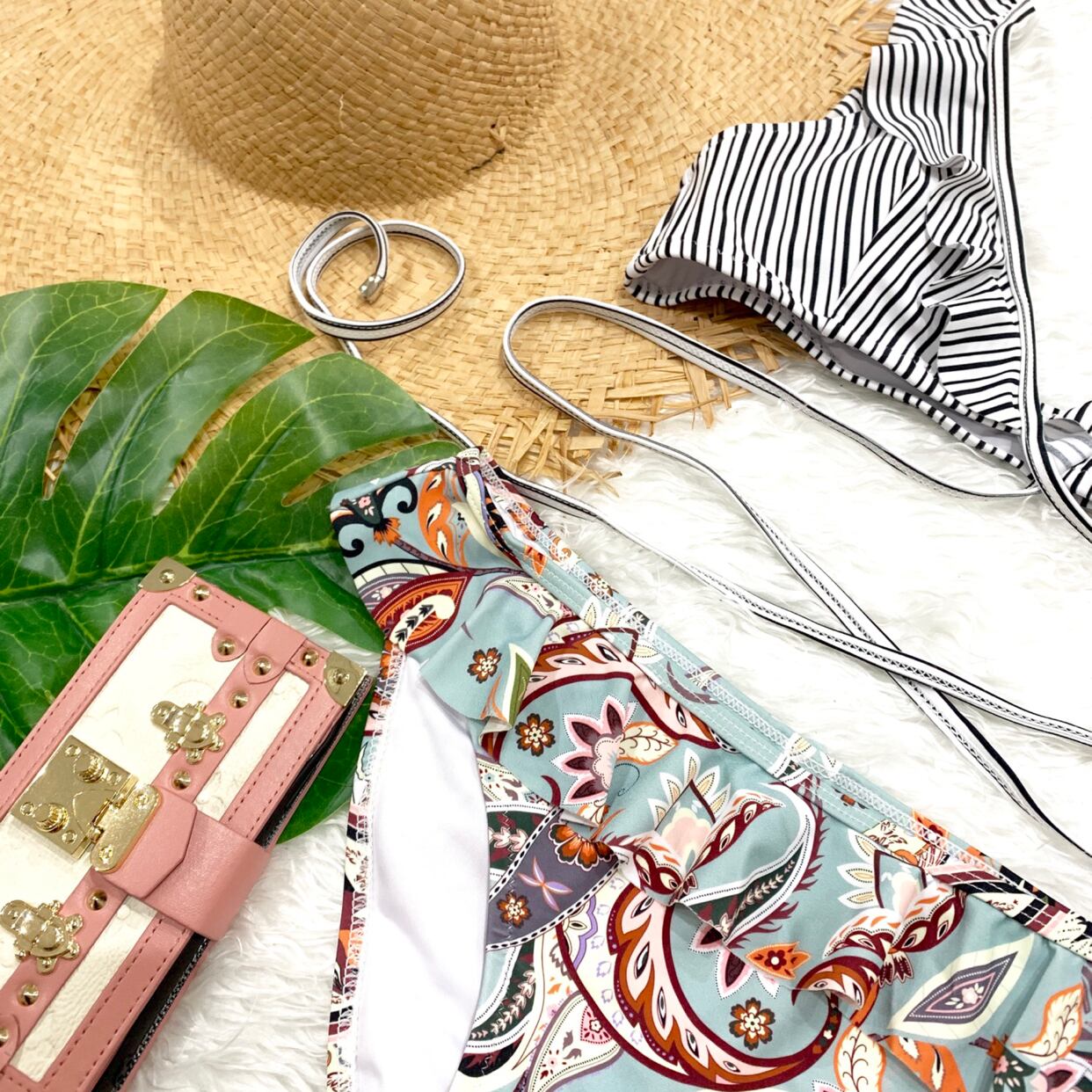 トップスはストライプ、パンツはペイズリー柄の大人可愛いビキニです。