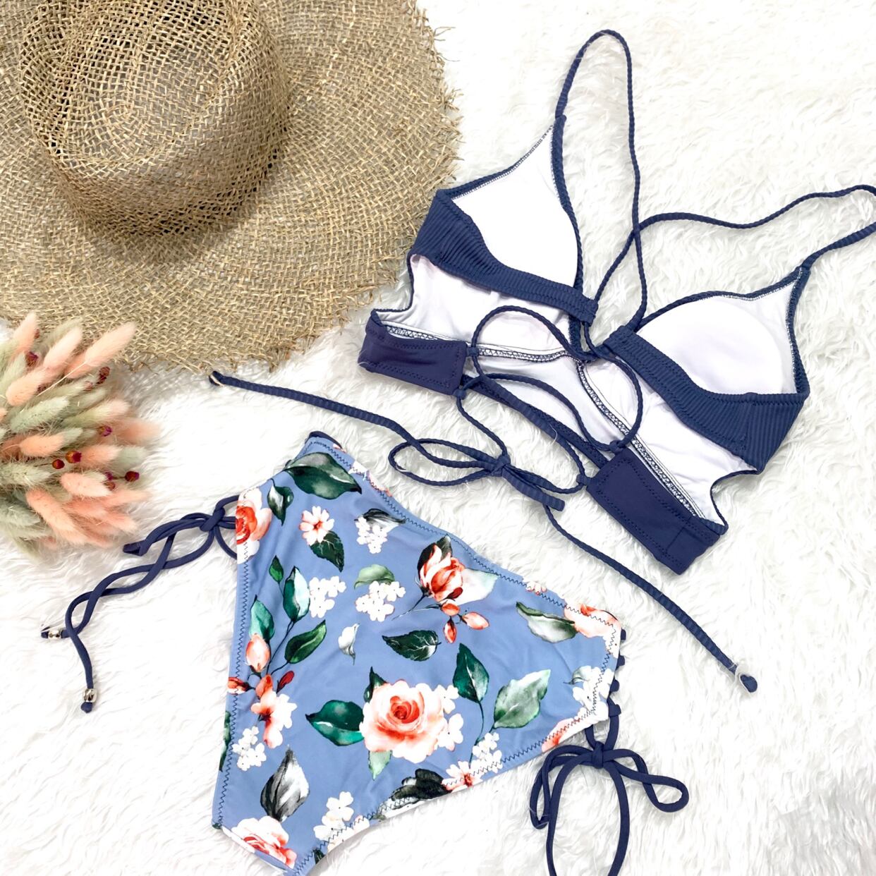トップス綺麗なセルリアンブルーにハイウエストパンツのビキニです。