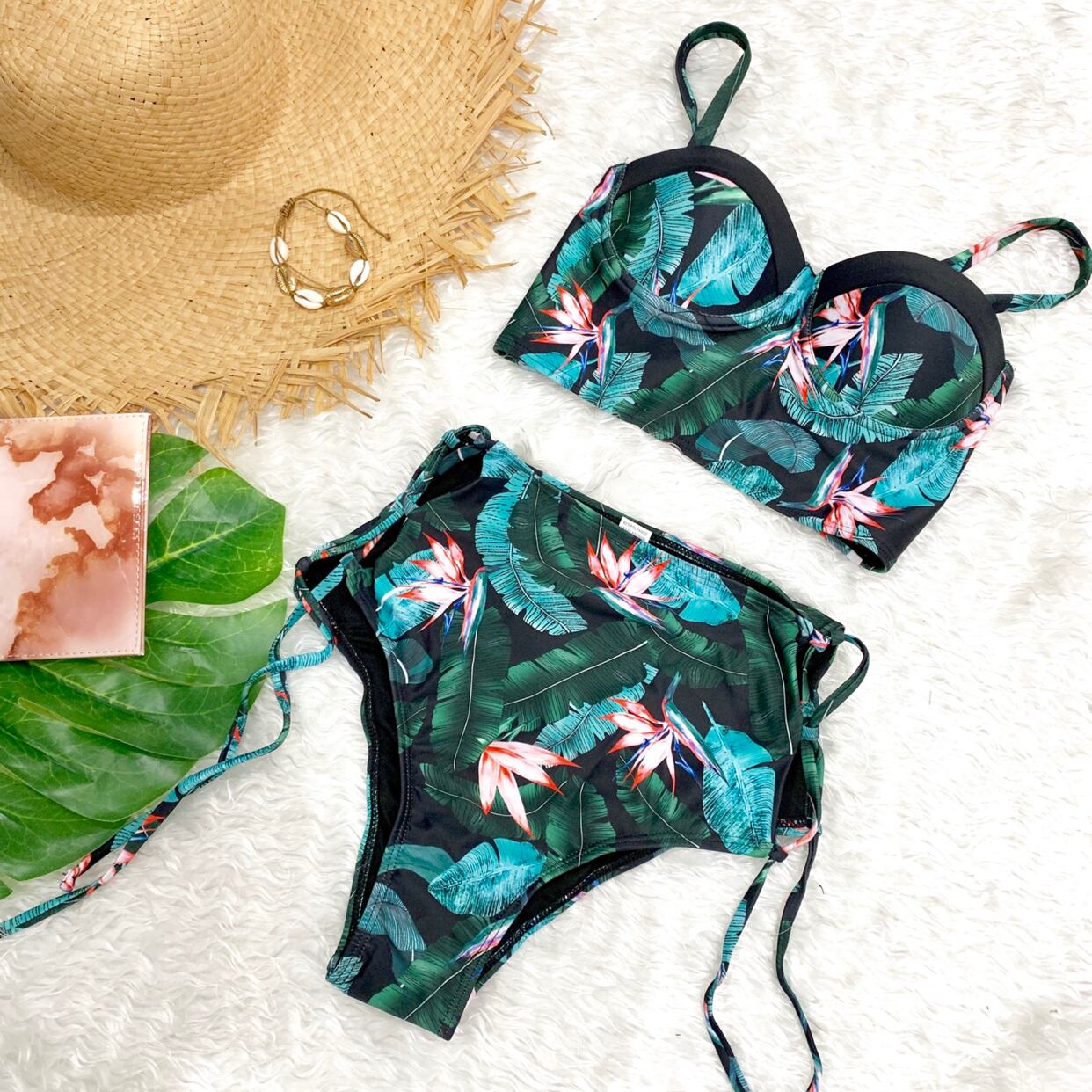 南国ムードたっぷりのバナナリーフとストレリチア柄のビキニです。