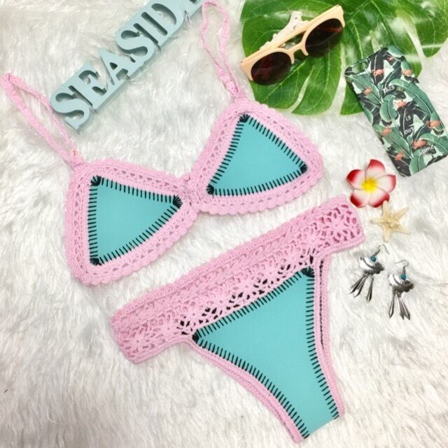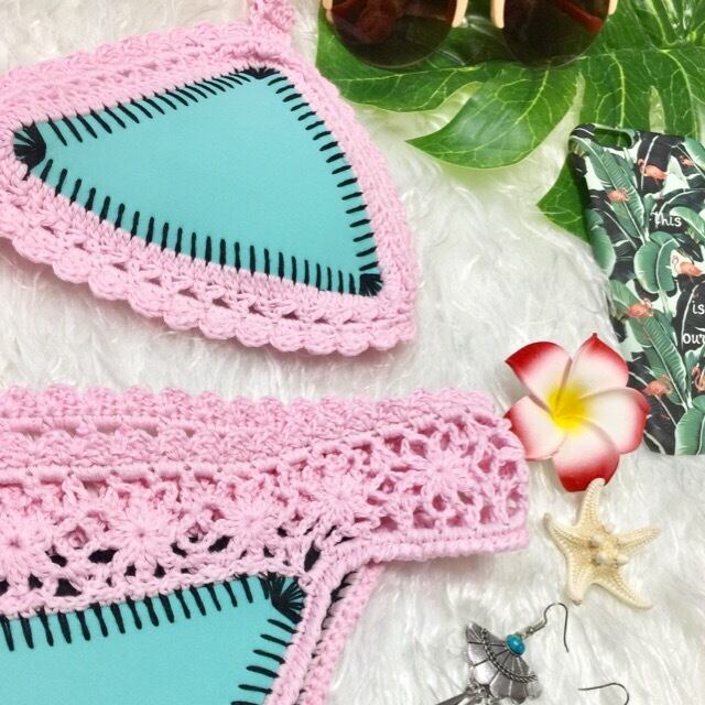 ピンクとミントグリーンのカラーが可愛いクロシェビキニです。