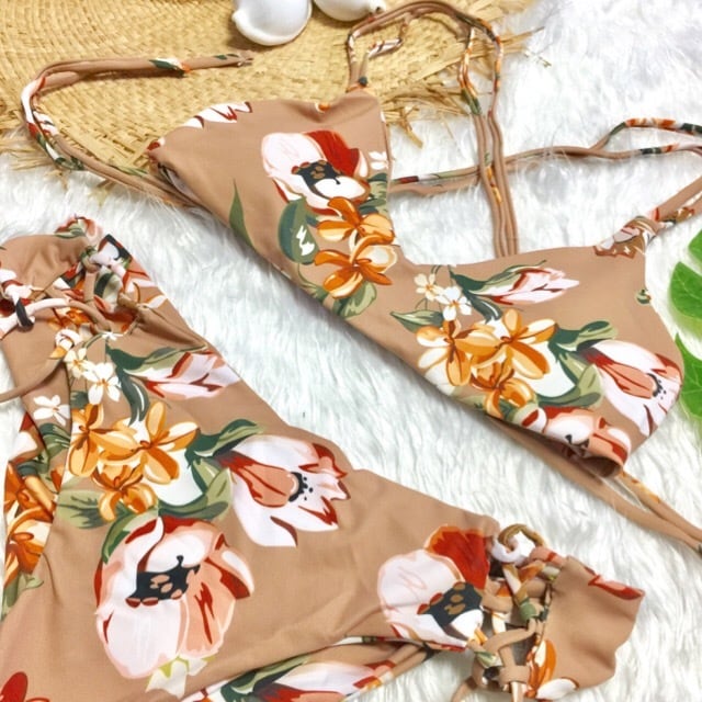 ミルクティーカラーに大きい花柄も大人の色気たっぷりのデザインビキニです。